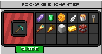 Each block you mine with your pickaxe will work towards increasing your pickaxe level. Increasing your pickaxe level will unlock new enchants which can be used on your pickaxe.